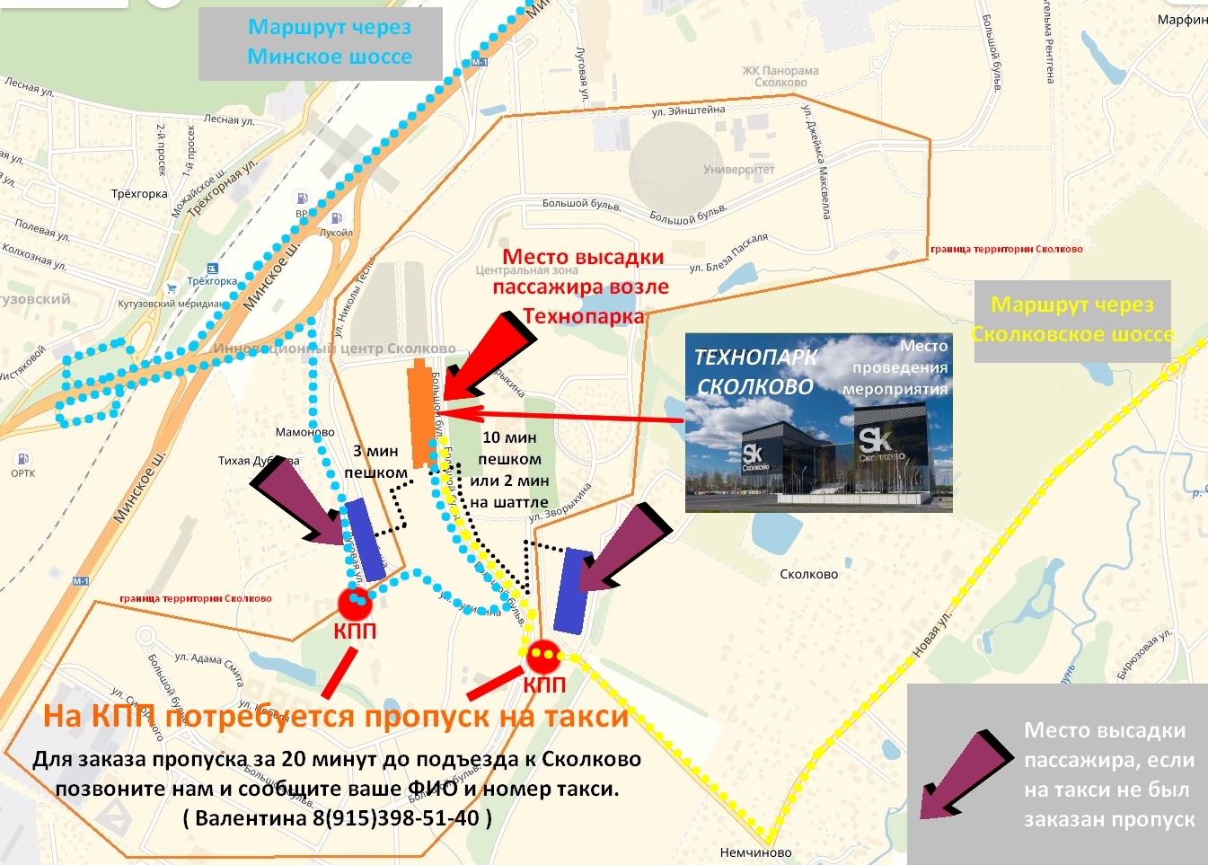 !!! Не доезжая до большого КПП со шлагбаумом, поверните направо, въезд на парковку «Сколковская» через 150 м (слева), далее 10 минут пешком или проезд на внутреннем шаттле (№1, №2, №4) до здания Технопарка. Проезд бесплатный.